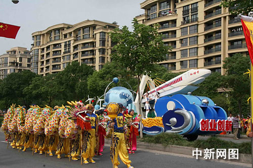 中新網(wǎng)杭州9月26日電(記者 汪恩民 袁爽 實習(xí)生 甘小虎)今天,在“浙江省慶祝新中國成立60周年文藝巡游活動”上,彩車斗艷,浙江各地市紛紛以獨具特色的民間藝術(shù)獻(xiàn)禮祖國六十年壽辰。