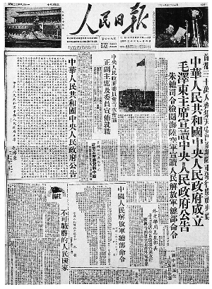 “ 共產(chǎn)黨的新聞機構(gòu)報道,約二百萬人聚集在一起收聽這個歷史性的宣告,所有人的目光都聚集在毛澤東升起的那面新中國的標志——五星紅旗,樂隊演奏新國歌《義勇軍進行曲》。其后,舉行游行儀式。軍隊接受朱德將軍的檢閱,編隊經(jīng)過天安門,有的配備最新的美國大炮、坦克以及從國民黨手中繳獲的裝甲車。共產(chǎn)黨空軍轟炸機編隊飛行,煙花爆竹和其他游行活動直至深夜。有報道指出,這種歡慶活動將持續(xù)3天左右,與推翻清政府統(tǒng)治的‘雙十節(jié)’共慶!