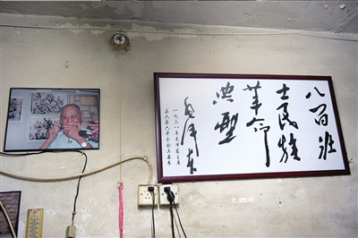 王家將靈堂設(shè)在老人臥室之中,不大的臥室里擺放著網(wǎng)友送來(lái)的花圈,挽聯(lián)上寫著“沉痛悼念抗日英雄王文川先生”。老人的遺像安放在靈堂正中,遺像中的老人戴著眼鏡神態(tài)安詳,遺像前擺放著老人生前佩戴的手表和一把上海牌口琴。
