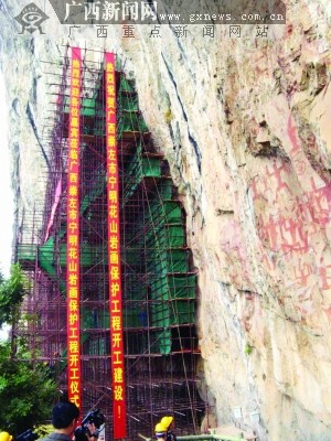 昨日上午,在簡短而隆重的開工儀式后,廣西崇左市寧明花山巖畫保護工程正式開工。花山巖畫保護前期工作長達18年,僅在方案研究、材料試驗和方案設計等工作上就耗時5年,其所動用的學科領域和專家之廣、所耗資金之多,不僅在廣西文物保護史上史無前例,就是在中國文物保護史上也極為罕見,而此次開工的第一期搶救性加固工程被專家稱為“要干救命的活”。那么等著“救命”的花山巖畫其病害危重到什么程度?為什么前期工作要花費那么長時間?一期保護工程將使用哪些先進技術?我們以后還能不能看到它的原貌?記者在保護工程現(xiàn)場進行了采訪。