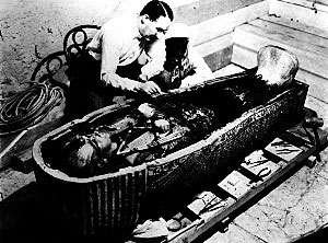 圖坦卡蒙陵墓的發(fā)掘被認(rèn)為是考古學(xué)史上最榮耀的時(shí)刻之一。墓穴的四個(gè)房間里發(fā)現(xiàn)了超過五千件以上的陪葬品,包括家具、香水瓶、蒼蠅拍和鴕鳥毛等。最重要的是,卡特發(fā)現(xiàn)了一具重約134.3公斤黃金打造的棺槨,找到了戴黃金面具的圖坦卡蒙王木乃伊。