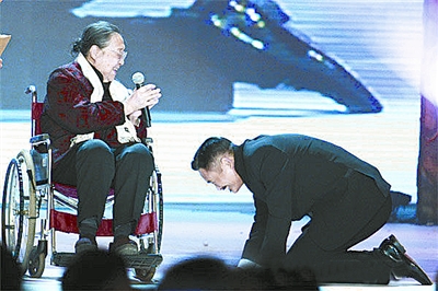 被譽為2010中國第一史詩巨片的《孔子》,1月中旬在北京舉行首映慶典,慶典上孔子的第77代嫡孫女孔德懋女士坐著輪椅上臺,周潤發(fā)便一直在旁邊像子侄一樣跪著聽老太太講話?椎马渴①澲軡櫚l(fā)在電影《孔子》中飾演孔子的精彩表演,并將寫有“永遠的孔子”的橫幅贈送給發(fā)哥。這時,周潤發(fā)出人意料地向孔女士認真雙膝跪地叩首,隨后,與孔女士溫情擁抱,場面令人動容……