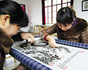 今年“兩會(huì)” 期間,溫家寶總理在記者招待會(huì)上借《富春山居圖》合璧的話(huà)題,表露了華夏兒女期盼祖國(guó)統(tǒng)一的心愿。這個(gè)信息使江蘇東臺(tái)市的工藝美術(shù)工作者大為觸動(dòng)。因?yàn)樵缭?008年,當(dāng)?shù)氐膬蓚(gè)美術(shù)師和8位繡娘歷時(shí)9個(gè)月曾制作了發(fā)繡作品《富春山居圖》,畫(huà)面藍(lán)本是原畫(huà)的后半部分《無(wú)用師卷》,這部作品在當(dāng)年的第八屆中國(guó)工藝美術(shù)大師作品暨中國(guó)工藝美術(shù)精品博覽會(huì)上獲得了金獎(jiǎng)。
