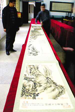 今年“兩會(huì)”期間,溫家寶總理說(shuō)出了讓傳世名畫(huà)《富春山居圖》合璧的心愿。昨天,從東臺(tái)市傳出消息,該市的工藝美術(shù)工作者運(yùn)用“民間一絕”的頭發(fā)刺繡技藝,照原樣大小成功制成了一幅發(fā)繡長(zhǎng)卷,完整再現(xiàn)了原畫(huà)的全貌,使這幅名畫(huà)分割在海峽兩岸的兩部分在發(fā)繡藝術(shù)天地里完美合璧。