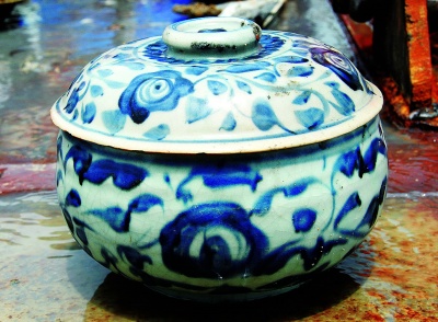 目前見(jiàn)到的文物種類(lèi)主要是青花瓷大盤(pán),此外也有青花瓷缽、青花小酒杯、青花碗、貼塑龍紋罐、銅板、鐵器及金屬凝結(jié)物等等。崔勇介紹,其中青花瓷大盤(pán)和帶蓋青花瓷缽是有代表性的器物,瓷胎和釉質(zhì)比較厚重,青花顏色不太鮮亮,發(fā)灰或者發(fā)黑,無(wú)論人物還是花草圖案都比較隨意,器表施滿釉,底足粘有細(xì)砂,即“砂足器”,屬于外銷(xiāo)瓷中的常見(jiàn)類(lèi)型。