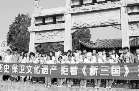 5月29日上午8點,南陽數(shù)百網(wǎng)友還在臥龍崗山門前的“千古人龍”牌坊下,拉起條幅,30名小學生齊聲誦讀前《出師表》,游人與市民簽名聲援;顒拥淖詈,幾名網(wǎng)友還抬出一臺電視機當場砸毀,以示對新《三國》的抗議。
