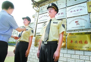 昨天(25日),北京市首批校園安全護(hù)衛(wèi)大隊(duì)的175名隊(duì)員被分配到了原西城區(qū)49所學(xué)校的58個(gè)校址。開學(xué)后,這些身著黃色標(biāo)準(zhǔn)制服,經(jīng)過半個(gè)月魔鬼訓(xùn)練,學(xué)習(xí)了格斗和急救技能的護(hù)衛(wèi)隊(duì)員將擔(dān)負(fù)起護(hù)衛(wèi)校園安全的重任。