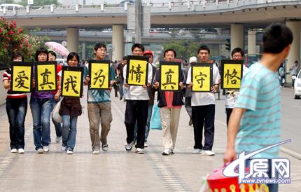 昨日上午,幾個來自中原工學院的大學生舉著“恪守真情為我真愛”的牌子出現(xiàn)在紫荊山廣場附近,他們選擇年輕人,特別是年輕情侶密集的地方活動,并請求他們在自己準備好的橫幅上簽名,支持自己“把第一次留給自己最愛的人”的觀點。