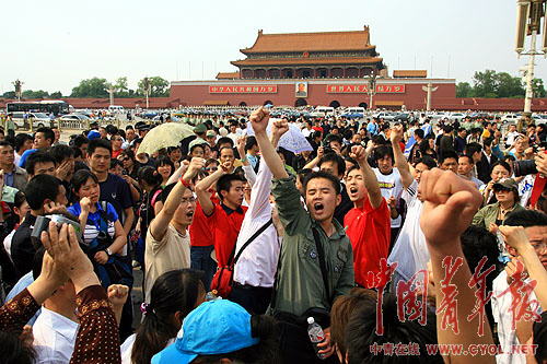 5月19日下午,天安門(mén)廣場(chǎng)上聚集了數(shù)萬(wàn)名參與哀悼活動(dòng)的群眾,在默哀完畢后,此起彼伏的“中國(guó)萬(wàn)歲”、“中國(guó)加油”的聲音響徹云霄。幾名四川籍在京大學(xué)生用四川話激昂高呼“四川雄起”,在場(chǎng)的四川人奮起響應(yīng),很快,來(lái)自全國(guó)各地的人們都受到強(qiáng)烈的震動(dòng),一起吶喊起來(lái),一聲聲感人肺腑的吶喊聲在天地間回蕩,一雙雙舉著國(guó)旗的手臂在廣場(chǎng)上有力的揮舞,廣場(chǎng)漾起了一片血色的愛(ài)國(guó)暖潮。