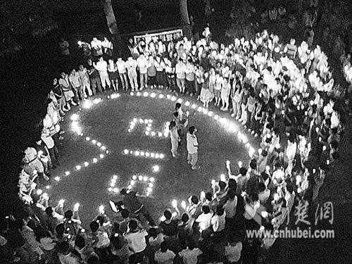 宿舍樓下,燭光組成大大的愛(ài)心和“5.12”字樣;500余名學(xué)生手捧蠟燭,為罹難同胞祈禱。前日晚,武漢工程大學(xué)武昌校區(qū)的一場(chǎng)畢業(yè)聚會(huì),顯得如此凝重。