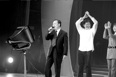 略顯緊張的周校長“喝口水”的要求得到滿足后,便從衣袋里掏出一張寫有歌詞的白紙,正式開唱。他手握麥克風(fēng),緊盯臺上的卡拉OK屏幕,高潮處他還會踮起腳尖“飆高音”。此時(shí),上任校長許智宏微笑著坐在臺下,隨聲輕和。