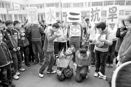“進(jìn)行這場(chǎng)行為藝術(shù)表演,是想通過(guò)節(jié)水等于抗旱的表演,讓同學(xué)們懂得旱情和我們的生活相關(guān)。身在城市,雖然沒(méi)法直接參與抗旱,但可以通過(guò)節(jié)約用水來(lái)幫助農(nóng)民伯伯!眳⒓颖硌莸耐瑢W(xué)們說(shuō)。首席記者張可丹文記者白周峰圖