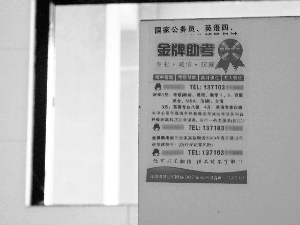 近日,廣州大部分高校均已開學,同時計算機等級以及英語四六級等多項考試也被擺上眾多考生們的日程表。而就在此時,部分網(wǎng)站以及校園的公告欄,甚至是校園廁所墻上,各種惡俗小廣告也隨之現(xiàn)身,有人吹噓有各種考題及答案來源可靠,另外,出租“情侶旅店”的小廣告也悄然出現(xiàn)。記者調(diào)查發(fā)現(xiàn),絕大多數(shù)的小廣告都存在欺詐,見錢后隨即“人間蒸發(fā)”。校方提醒廣大學子,不要輕信各種有關(guān)考題出售的信息,一旦發(fā)現(xiàn)應(yīng)及時舉報,配合打擊。