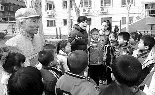 3月5日,濟(jì)南新苑小學(xué)的老師在雷鋒塑像前給學(xué)生講述雷鋒生前故事。