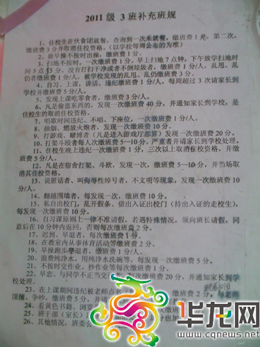 如此多的學(xué)生被扣分、罰款,其依據(jù)是什么?在班上同學(xué)的指引下,記者在該班教室進(jìn)門靠左的墻上看到兩張《2011級3班補(bǔ)充班規(guī)》,班上同學(xué)告訴記者:該班規(guī)就是扣分、繳罰款的依據(jù)。