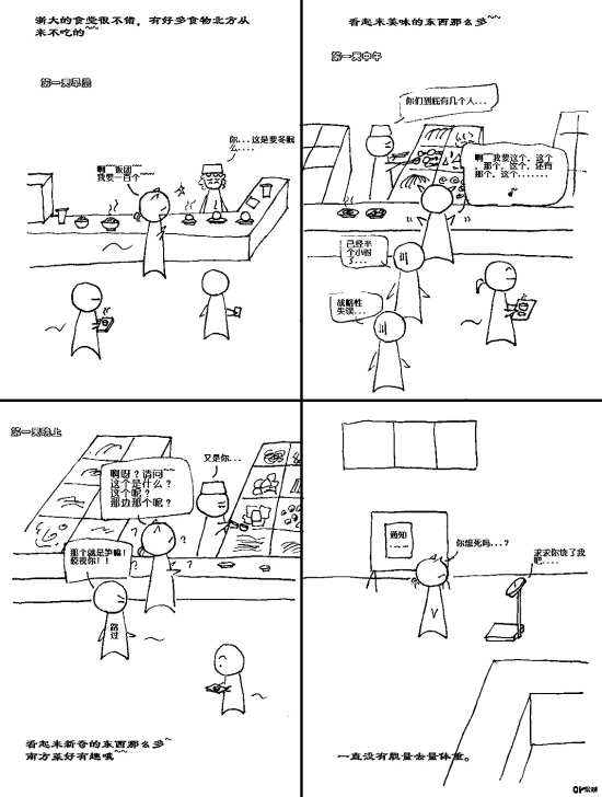 “很有生活氣息啊。樓主MM這一個(gè)月活得比我們4年還精彩啊!本W(wǎng)友直言,貼近生活的漫畫看起來輕松愉快,細(xì)細(xì)瀏覽,還會想起自己曾經(jīng)的菜鳥生活,“剛來紫金港的時(shí)候,我也幾乎天天迷路”,“想起自己剛進(jìn)大學(xué)的時(shí)候,也是對什么都好奇啊!