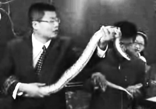將一條長達(dá)2米多、重達(dá)5公斤的蟒蛇抱到課堂上當(dāng)“模特”,教學(xué)生學(xué)習(xí)動物寫生的技巧。武漢市第五十九中教師鄒華章抱蟒蛇上課的視頻,近日在網(wǎng)絡(luò)上瘋傳。從10月27日上網(wǎng)到昨日,共有400多個網(wǎng)站轉(zhuǎn)載這一視頻,其中在一家網(wǎng)站的點(diǎn)擊率已高達(dá)12.6萬人次。