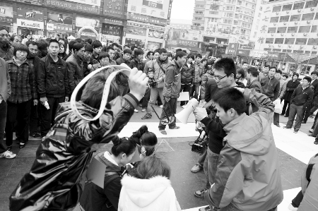 河南商報報道因發(fā)帖指責鄭州艾迪美文化傳媒有限公司(以下簡稱艾迪美公司)不退還押金,是個“騙子”,4月7日,發(fā)帖者稱遭到了該公司人員皮帶抽、拳頭打的噩運。昨天,發(fā)帖者和部分受害者在二七廣場聚會,以“行為藝術(shù)”再現(xiàn)艾迪美公司打人的場景。