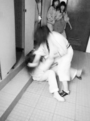 殷瓊是上海西南工程學(xué)校一年級(jí)學(xué)生。4月16日下午,她參加考試,題目差不多做完了,同學(xué)小成對(duì)她耳語:“下課去校門口,有人找你談話。”殷瓊沒答應(yīng),小成幫她交卷,把她拉到校內(nèi)一幢大樓2樓女廁所門前,那里還有幾個(gè)女生在等著。拉扯進(jìn)廁所后,另一名同學(xué)劉幸一邊拍她肩膀挑釁,一邊讓其他女生打開手機(jī)攝錄。視頻記錄了殷瓊的噩夢(mèng),殷瓊的母親向記者出示了這段影像: