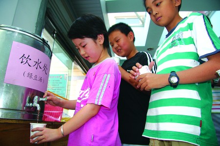 24日,槐蔭區(qū)中小學(xué)校進(jìn)行了本學(xué)期的階段性測(cè)試,記者在濟(jì)南市經(jīng)七路第一小學(xué)看到,學(xué)校為學(xué)生們熬好了綠豆湯,學(xué)校衛(wèi)生室為每個(gè)教室準(zhǔn)備了藿香正氣水、人丹、清涼油等防暑的藥品,保證學(xué)生安心考試。