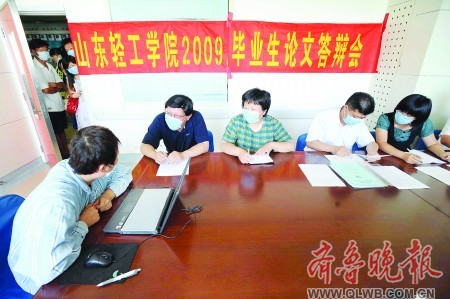 24日上午9點(diǎn)45分,一條標(biāo)有“山東輕工學(xué)院2009畢業(yè)生論文答辯會(huì)”的紅色橫幅掛在山大二院血液科會(huì)議室里,山輕工食品與生物工程學(xué)院的五位老師戴著藍(lán)色口罩一字排開,坐在一張長(zhǎng)條桌的一側(cè)。張萍穿著住院服,戴著口罩在同學(xué)彭愛琴的攙扶下來到會(huì)議室。