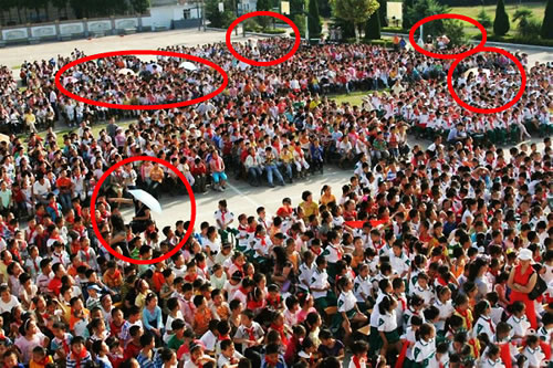 新學期開學后的一天下午,時值“秋老虎天氣”,氣溫達到三十四度,濱海縣實驗小學兩千余名小學生服裝整齊地聚集在烈日下的大操場上舉行秋學期開學典禮。次日,該縣教育網(wǎng)站發(fā)了題為《濱?h實驗小學舉行2009年秋季開學典禮》的報道,隨文還配發(fā)了三幅圖片,其中有一圖片顯示,密密麻麻的學生方陣中,約有十位女教師打傘防曬。
