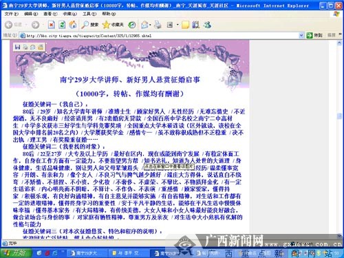 古有“比武招親”,今有“以文招親”。10月4日,一位網名叫“南寧講師懸賞征婚”的男子在廣西新聞網紅豆論壇、天涯社區(qū)中,寫下萬字征婚啟事,并發(fā)出15道“應征必答題”,欲通過征集答題,實現(xiàn)一個篩選的過程。帖子表示,本次征婚,所有的入圍者都將從給他的電郵發(fā)來答案的女孩中選出。