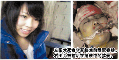 去年12月26日凌晨,湖南打工妹李彩虹離開工作的酒店返回宿舍,誰(shuí)料走到花都區(qū)新華街與商業(yè)大道的交叉口時(shí),一輛紅色寶馬Mini小轎車飛馳而過(guò),將她撞死。駕車人是廣東外語(yǔ)外貿(mào)大學(xué)大三學(xué)生任偉煒。兩人是同齡人,當(dāng)時(shí)都只有21歲。肇事者任偉煒當(dāng)即駕車逃逸,至今未歸案。
