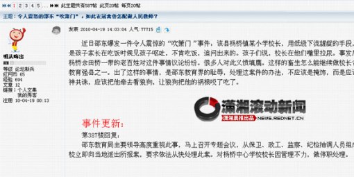 19日晚,有網(wǎng)友將此事發(fā)帖在紅網(wǎng)論壇上,立即引來眾網(wǎng)友熱議,已有7萬多網(wǎng)友點(diǎn)擊關(guān)注,同時(shí)也引起當(dāng)?shù)亟逃块T關(guān)注。據(jù)瀟湘晨報(bào)滾動(dòng)新聞?dòng)浾吡私獾,目前,此事已?bào)案,當(dāng)?shù)亟逃块T和警方就此事展開調(diào)查。