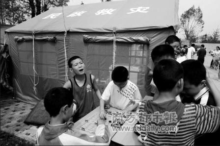19日10時(shí)30分:谷勝聰坐在初一教學(xué)部的電腦前,15平方米大的帳篷里坐著近10名老師。檢查過記者的證件后,谷勝聰拿出一包潤喉糖,拿出一顆后又塞進(jìn)包里。