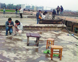 3月 28日上午,是今年全國計算機(jī)考試的筆試時間,據(jù)該學(xué)員說,老師考前讓每名考生帶一位親友,統(tǒng)一在學(xué)校教室集合。筆試開始幾分鐘后,教室里的老師便得到了考題。老師在黑板上一行行地寫出了:1-5324431-641423……人們紛紛拿出手機(jī)(見上圖)。20多分鐘后,這名老師擦去黑板上的字,急急離去。由于朱洪學(xué)校當(dāng)天參加筆試的約有幾百名學(xué)員,從教室里到外面空地,忙著發(fā)送短信的考生親友隨處可見(見下圖)。該知情者說,那名老師寫在黑板上的 “32443”分別代表著“CBDDC”,這些“數(shù)字”和隨后寫出的“漢字”,便是筆試中的“選擇題”和“填空題”的答案。