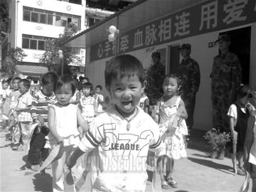 5·12地震時,龍門山鎮(zhèn)幼兒園100多名孩子正在幼兒園午睡,5名老師冒著生命危險將他們?nèi)繐屃顺鰜,但校舍卻成了危房!霸倏嗖荒芸嗪⒆!”在龍門山鎮(zhèn)參加救援的廣州空軍官兵知道后,立即著手為孩子們重建樂園。