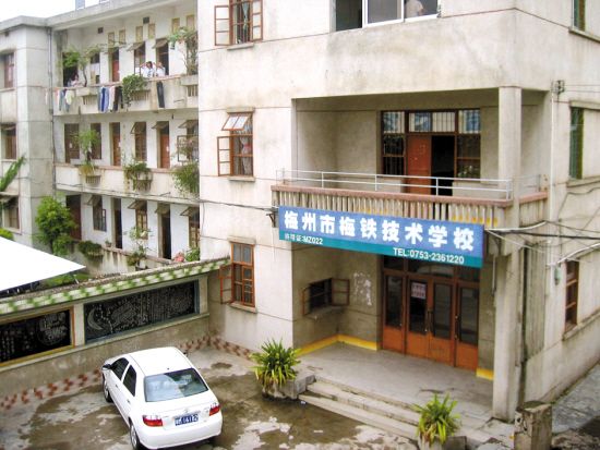 前天下午,記者與梅江區(qū)教育局相關(guān)人員來到梅鐵技校調(diào)查。穿過破舊的老廠區(qū)大門,只見兩棟相對而立的破舊3層小樓,這就是梅鐵技校學(xué)生宿舍兼教學(xué)樓。在該校,找不到圖書室,體育器材只有兩個破籃球架。