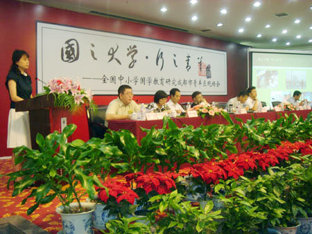 7月8日,全國中小學(xué)國學(xué)教育研究成都市青羊區(qū)現(xiàn)場會在蓉召開,來自北京、青島、重慶等地的上百名專家代表就國學(xué)教育在中小學(xué)校園內(nèi)的開展進(jìn)行了交流討論。據(jù)中國教育部語言文字應(yīng)用管理司司長王登峰透露,有關(guān)部門準(zhǔn)備邀請歌星演唱經(jīng)典詩詞,以契合中小學(xué)生的年齡特點和心理需求。