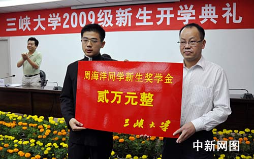 開學(xué)典禮上,三峽大學(xué)校長李建林為5名新生頒發(fā)錄取通知書,三峽大學(xué)黨委副書記何偉軍為周海洋頒發(fā)了2萬元新生獎(jiǎng)學(xué)金。隨后,周海洋作為新生代表發(fā)言,他說,自己是懷著感恩的心態(tài)進(jìn)入三峽大學(xué)的,站在新的人生起點(diǎn),他最大的希望是4年內(nèi)學(xué)有所成,以此報(bào)答學(xué)校的培養(yǎng)和家人的厚望。周海洋的發(fā)言不似他的文章那般酣暢淋漓,而是顯得有點(diǎn)語無倫次,他多次表示是由于太激動(dòng)的緣故。