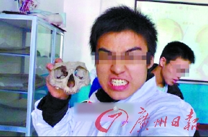 在一個有著大學實驗室裝修和陳設特點的房間里,幾個在上實驗課的身穿白大褂的醫(yī)學院男女學生,擺弄著人體骨架擺POSE拍照,其中一個長相清秀的女孩,頭頂半個頭骨做“皇冠”,右手則舉著一根骨頭作“權杖”狀,面對鏡頭露出燦爛微笑……