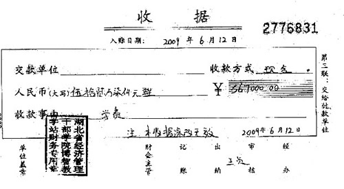 6月15日,學(xué);I集了45萬(wàn)元現(xiàn)金,匯給了楊某的指定賬戶(hù)。令人意外的是,這個(gè)賬戶(hù)并不是學(xué)校的公共賬戶(hù),而是一個(gè)名叫“王貞”的私人賬戶(hù)。等他們拿到收據(jù)后,上面蓋的公章是“湖北省經(jīng)濟(jì)管理干部學(xué)院博智教學(xué)站”。
