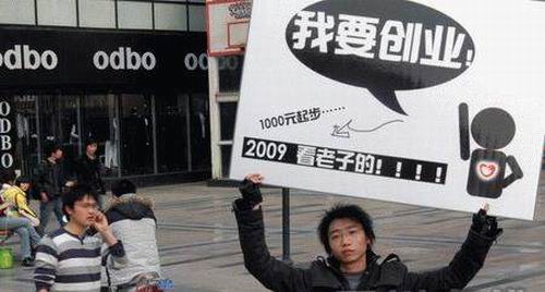 “我要?jiǎng)?chuàng)業(yè),1000元起步……2009,看老子的!”昨(8)日下午4時(shí)許,香檳廣場(chǎng)上,一名小伙子擺出一副“牛”架勢(shì),舉著自制的告示牌,喊著“自主創(chuàng)業(yè)”的口號(hào),引來(lái)了附近路人紛紛駐足觀看。