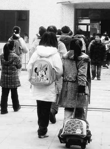 “書包太重了,里面都是每天要用的課本和練習冊,將近3公斤。”送孩子上學的李奶奶一手拿著書包,一手拿著畫箱說,“今天還有圖畫課,不光要帶彩色筆,還要帶剪刀、橡皮泥等文具!