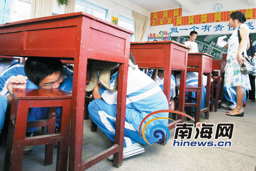 11日下午,?谑械卣鹪O(shè)防中心副主任、全國(guó)十佳少先隊(duì)志愿者輔導(dǎo)員何照全向海口一中初中部的老師們進(jìn)行抗震培訓(xùn),在記者及海南廣播電視臺(tái)音樂(lè)廣播節(jié)目部副主任衛(wèi)華的建議下,何照全隨機(jī)指導(dǎo)初一某班學(xué)生進(jìn)行防震演習(xí)。他先向?qū)W生們講解了防震的基本常識(shí):如果在學(xué)校教室上課,從顛簸與搖晃中斷定是地震,老師應(yīng)立即命令大家不要慌,迅速蹲下來(lái)躲在桌子下,最好再拿書包護(hù)著頭部。待地震停止時(shí),老師立刻組織學(xué)生們有秩序地撤離,到操場(chǎng)上集合。