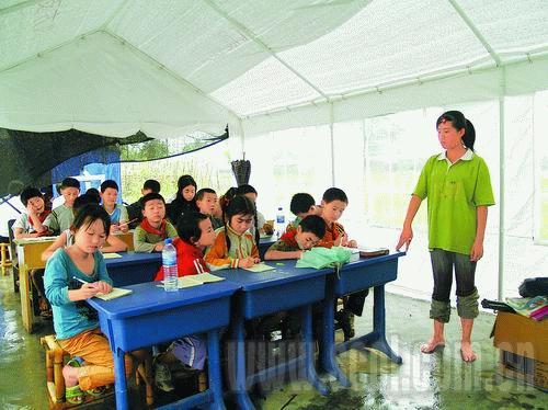 地震使土門等沿山鄉(xiāng)鎮(zhèn)的學(xué)校變成一片廢墟,孩子們只得終日玩耍。雙龍村建起帳篷學(xué)校后,因地震提前放假回家的高一學(xué)生張勇,主動擔(dān)任了校長,他的表哥、18歲的黃忠劍則擔(dān)任了該鎮(zhèn)三溪寺村帳篷學(xué)校的校長。