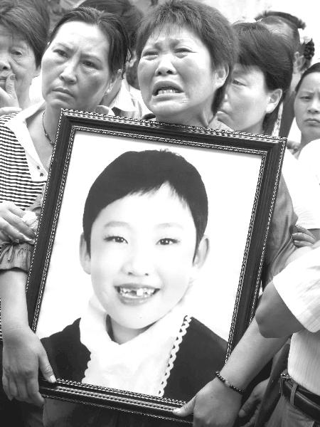 盡管還未開庭,但法庭外已聚集了數(shù)百名群眾,其中,受害人的親屬舉著死者生前的照片聲淚俱下地控訴著殺人兇手,不時(shí)有群眾擦拭眼淚!拔沂菍3虖10多里外的常莊鄉(xiāng)趕過來的,我要看看這個(gè)殺人女教師究竟長什么樣,要看看她為什么要?dú)⒑ψ约耗陜H8歲的學(xué)生!爆F(xiàn)場一位老太太說。