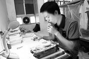 他租住在華師旁,15平方的房間200元一個月,除了衛(wèi)生間,被一張高低床和一張書桌擠的滿滿當(dāng)當(dāng)。書桌上攤放著一本物理參考書,旁邊還堆著厚厚一摞課本和各種復(fù)習(xí)資料,桌上還有《古文觀止》、《道德經(jīng)》等讀物。