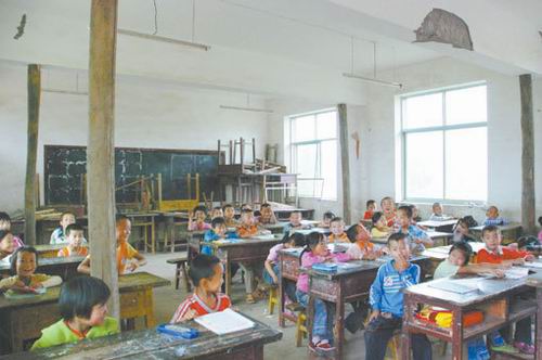 近日部分學(xué)生反映,今秋開學(xué)后西安市藍田縣湯峪鎮(zhèn)張坡村小學(xué)學(xué)生仍在地震損壞布滿支撐立柱的教室中上課,9月2日記者在藍田縣教育局了解情況時,該局計財科負責(zé)人樊繼剛老師對記者說:“藍田縣地震損壞校舍修復(fù)問題有望9月底前得到解決,希望家長理解。”