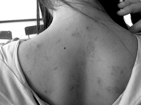 剛開學(xué)不久,四川省弘博中等專業(yè)學(xué)校新生羅珊只是身上少數(shù)部位出現(xiàn)了紅疙瘩,她以為是被蚊子叮咬也就沒放在心上。可隔了幾天寢室里的8名同學(xué)都陸續(xù)長滿了“紅包包”,大家才開始著急起來。“特別是襠部、腿部等隱秘部位,一出汗又痛又癢,又不方便撓!迸⒂行┎缓靡馑嫉卣f。記者見到女孩背部紅了一片,癥狀較輕的脖子竟已經(jīng)被撓壞。因?yàn)閷W(xué)校為封閉式管理,學(xué)生們并沒有到醫(yī)院醫(yī)治,只到衛(wèi)生站診治了一下或僅是簡單地涂了些外用藥。