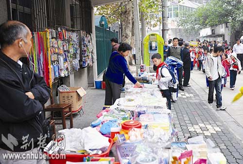 胡女士的兒子說,這些東西都是在學校門口的小攤上買的;有的同學一次拿不出幾十元錢,攤主還允許他們“分期付款”。胡女士曾找過攤主,指責他們不該用這種方式引誘小學生,但攤主沒有理會。