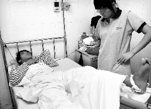 記者在病房?jī)?nèi)看到了這名留院治療的學(xué)生。他的左小腿纏著厚厚的繃帶,疲憊地躺在病床上,面對(duì)外人問(wèn)話一言不發(fā)。記者從診斷書上看到,這名學(xué)生叫鄭×,18歲,左脛腓骨中下段骨折。陪護(hù)同學(xué)后來(lái)告訴記者,他們是07級(jí)藥物制劑班的學(xué)生,班上共7名學(xué)生因打架受傷入院,其中6人輕微皮外傷,在包扎后都已回校。