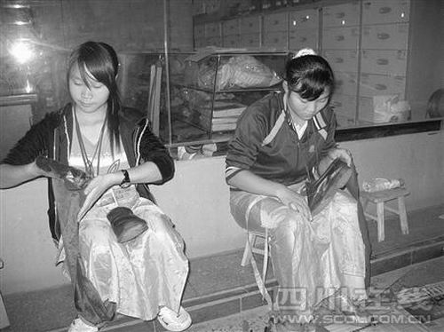 在一家火鍋店,電子專業(yè)高二學(xué)生邱飛詢問一位顧客是否需要擦鞋——行話叫做“聯(lián)系貨物”。和一般的擦鞋人一人擦一雙不一樣,學(xué)生們的擦鞋是流水作業(yè):第一人先用清水勾縫、第二人上油、第三人用刷子拋光、第四人用抹布拋光……一雙皮鞋經(jīng)數(shù)人之手后,換得1元酬勞。