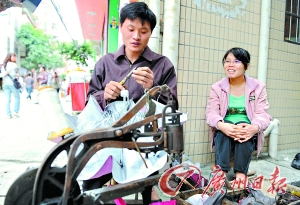 補鞋攤位與房子一街之隔,一張木凳,一臺機車,一個木制工具箱,這就是劉建文的謀生家當(dāng)。如今,年輕的夫婦倆每天坐在街上,妻子幫著拿東西,丈夫忙著修修補補,一雙鞋3元錢,一把雨傘2元錢!艾F(xiàn)在干這行的人多了,一天賺個40元已經(jīng)很不錯。”建文不無憂慮地表示,“房租230元,兩個人只有幾百元生活費,挺難的!