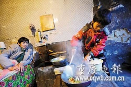 昨日(11月13日),記者在彭小林那幢土房里看到,這個家所有家具就是兩張床、一張桌子,一臺爸爸受傷前買的彩電是家里唯一的電器。家雖破舊,但整潔干凈。彭花權(quán)的床頭就是水龍頭和下水道,床上放著一根兩米長的竹竿,一頭裝著個鐵鉤,彭花權(quán)可躺在床上用它“拿”東西。家里的桌子、爐子腳下都安有輪子,不用費多大勁就能鉤到床邊。這些都是父子倆改裝的。